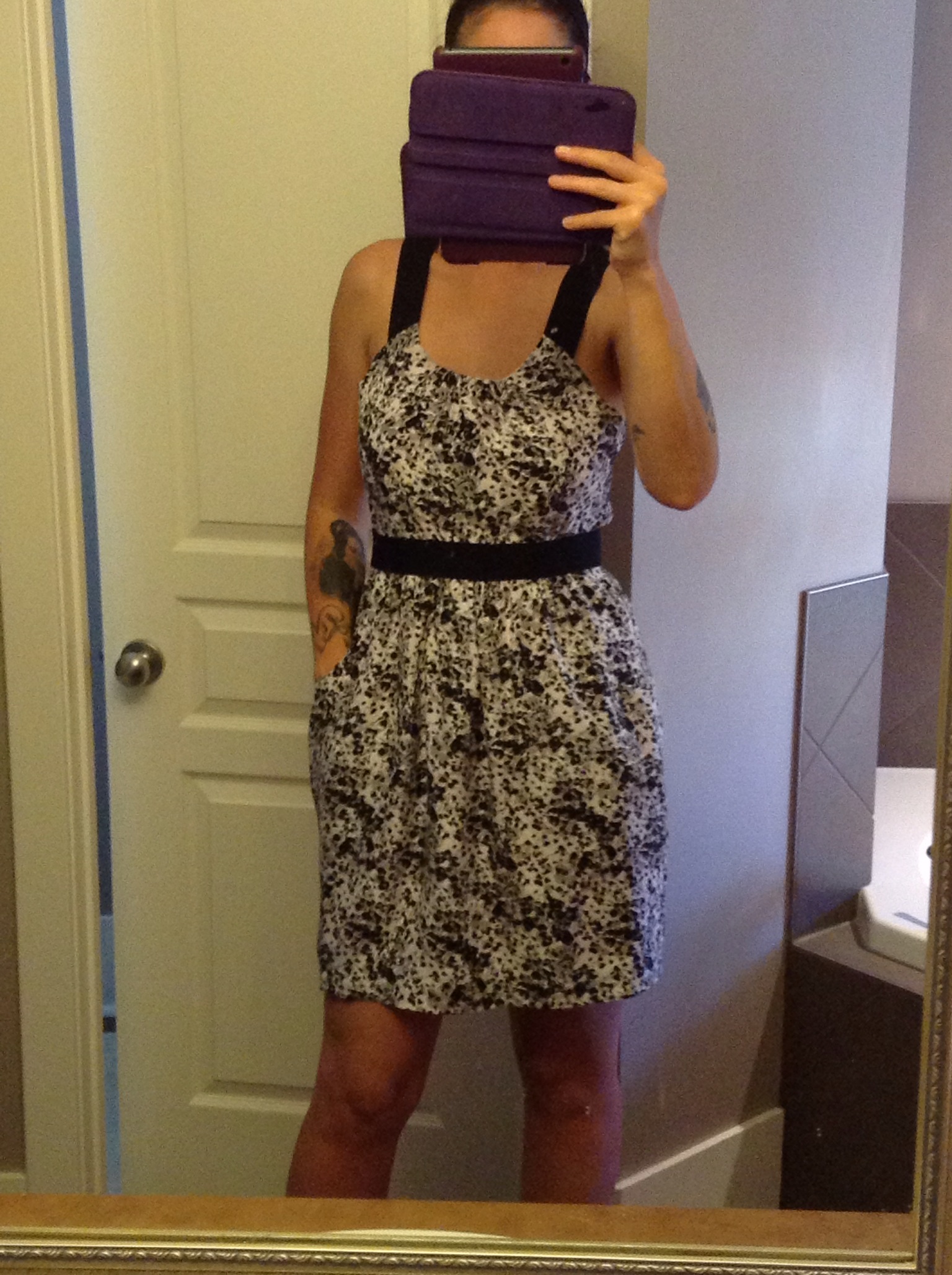 A selfie taken in the reflection of a mirror or window in order to capture a larger image such as a new dress in the fitting room or the bathroom, what evs.